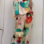 Ten zestaw składa się z luźnej bluzki i spodni z szerokimi nogawkami, obie części mają odważny, artystyczny wzór. Płynny kształt i gładka tekstura oferują podwyższone odczucie na relaksujące dni, weekendowe wyjścia lub kreatywne spotkania. Zaprojektowany z myślą o wizualnym wpływie i codziennym komforcie.
